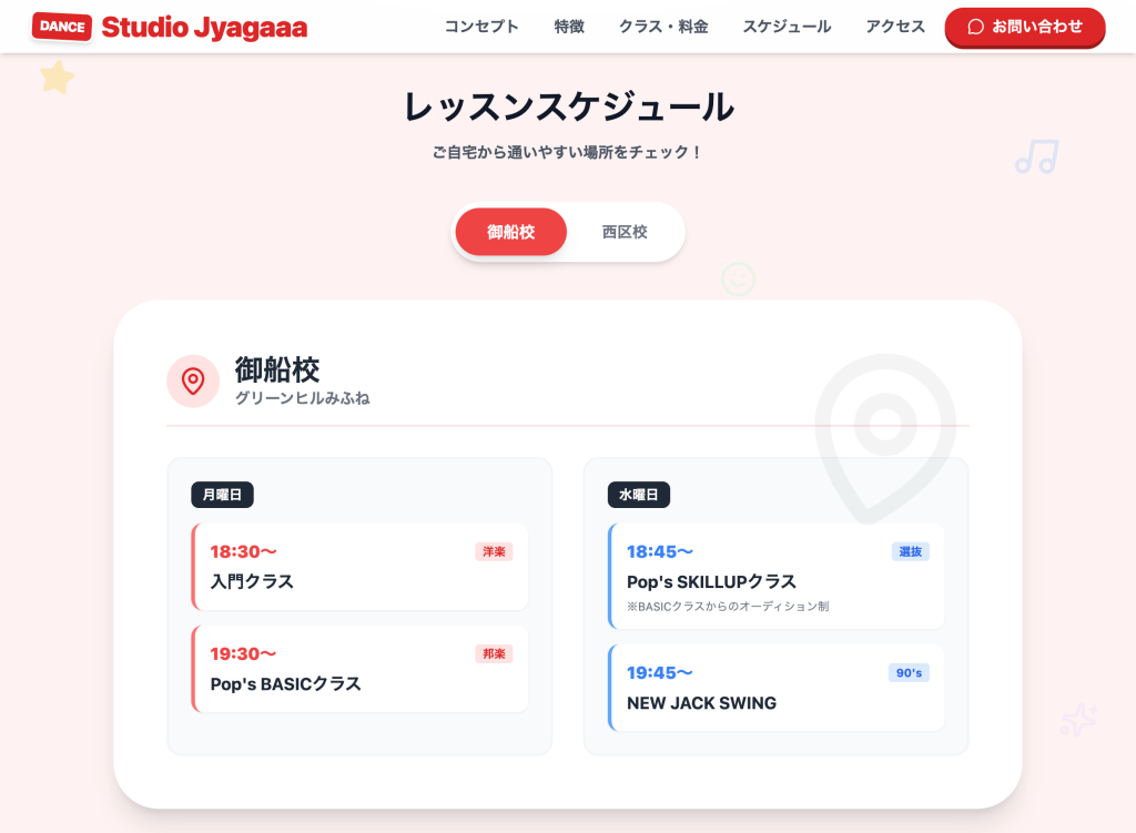キッズダンススクールの店舗ごとのレッスンスケジュールや店舗所在地をすぐに確認できるセクションを設置。スクールオーナー様ご自身で簡単にスクール情報を変更できるようにワードプレスの管理画面をカスタマイズしました。